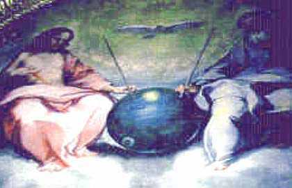appears in the sky surrounded with clouds. Ancient
